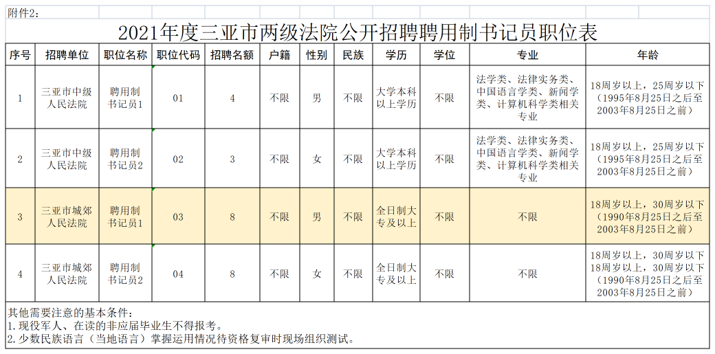 • 招聘單位:三亞市兩級法院 招聘人數(shù):8 截止日期:2021/9/1 17:30:00